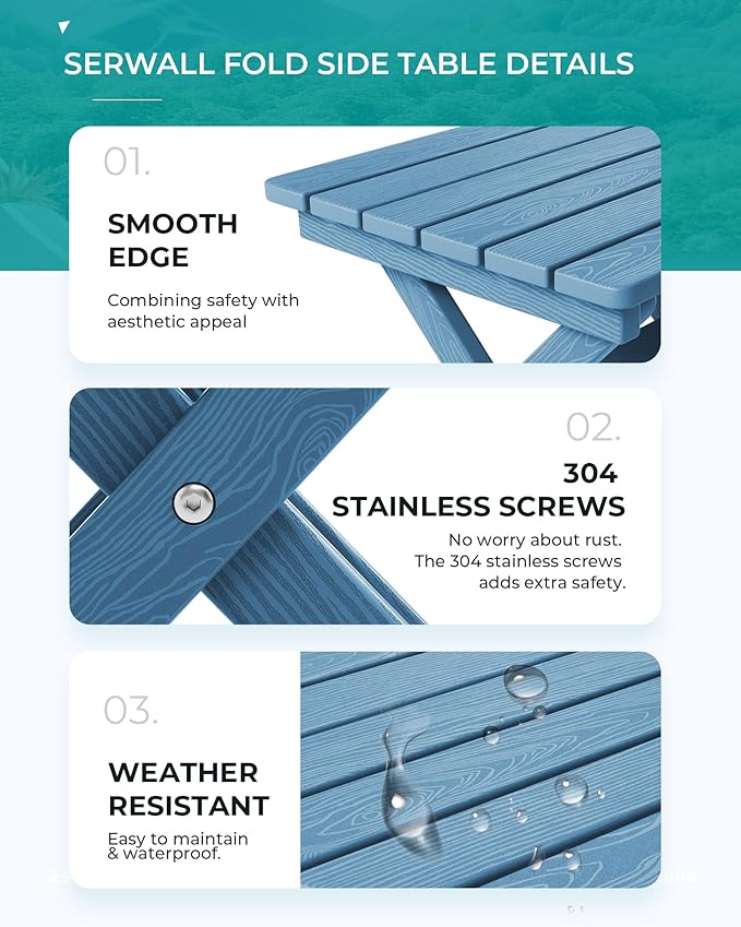- [Foldable Outdoor Side Table] The SERWALL Adirondack Side Table features a foldable design that significantly reduces its footprint when folded, providing an optimal space-saving solution for outdoor enthusiasts.