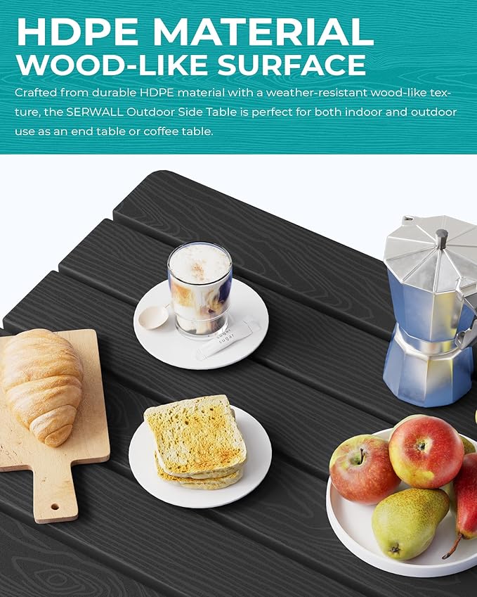 - [Premium Wood-Textured Surface] Offering the aesthetic appeal of wood without the upkeep, the SERWALL Side Table features a wood-textured HDPE surface that adds an elegant and natural touch to your outdoor decor.