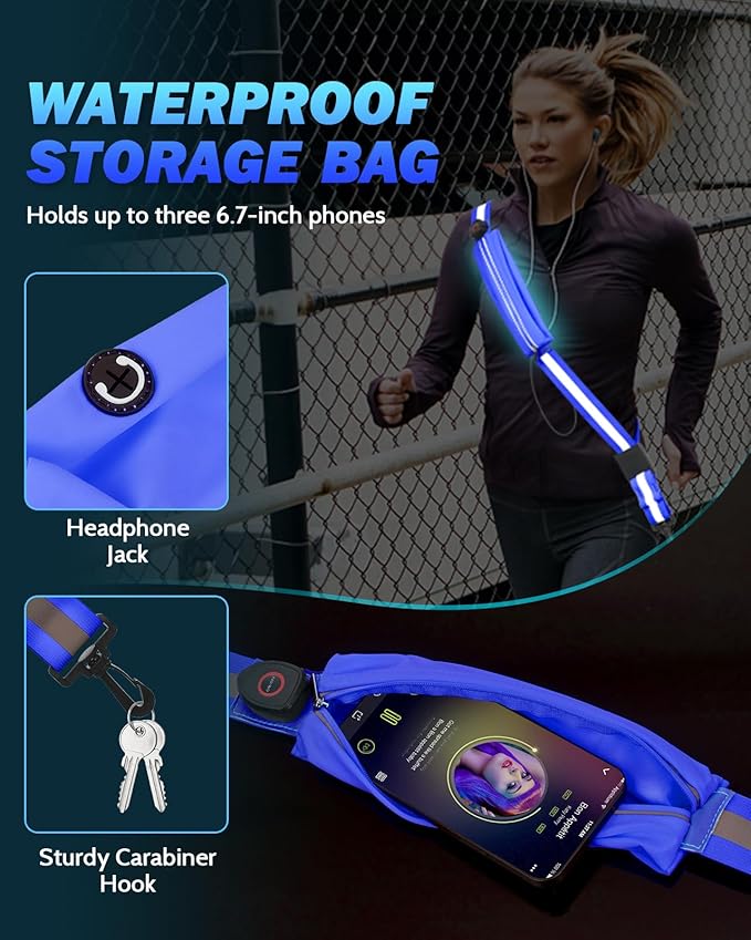- Waterproof Storage Bag: It accommodates up to three 6.7-inch phones and includes integrated headphone cable ports for on-the-go music enjoyment. The waterproof lining protects your items in rain or fog. Plus, with the carabiner hook at the end of the belt strap which helps carry keys or dog leash, keep your hands free at walking
