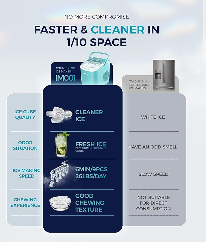 - Smart Operation & Self-Cleaning: The ice maker has advanced infrared sensor. The "ICE FULL" indicator flashes remind you to take out ice to prevent overflowing when the basket is full. And it'll remind you to add water by flashing "ADD WATER". Additionlly, the compact ice maker has a one-touch auto-cleaning function. Press the “ON/OFF” for 5s after adding water to run automatic mode for 30mins. Just get a clean ice maker without washing it by yourself