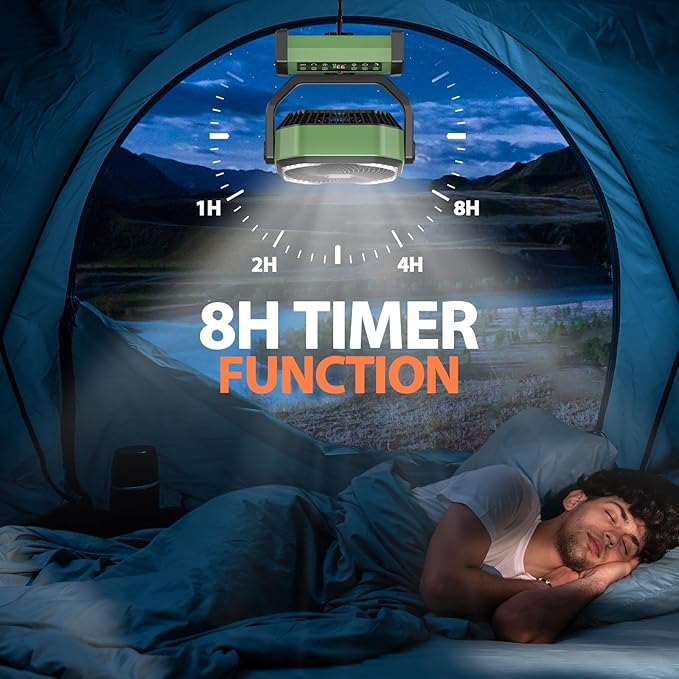 MORECORE 20000mAh Rechargeable Camping Fan with Light, 112HRS Running, 8-Speed, Auto Oscillating, Timer, LED Digital Display, 270°Pivot with Hook for Tent RV Emergency Garage-Army Green