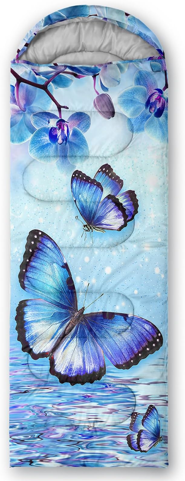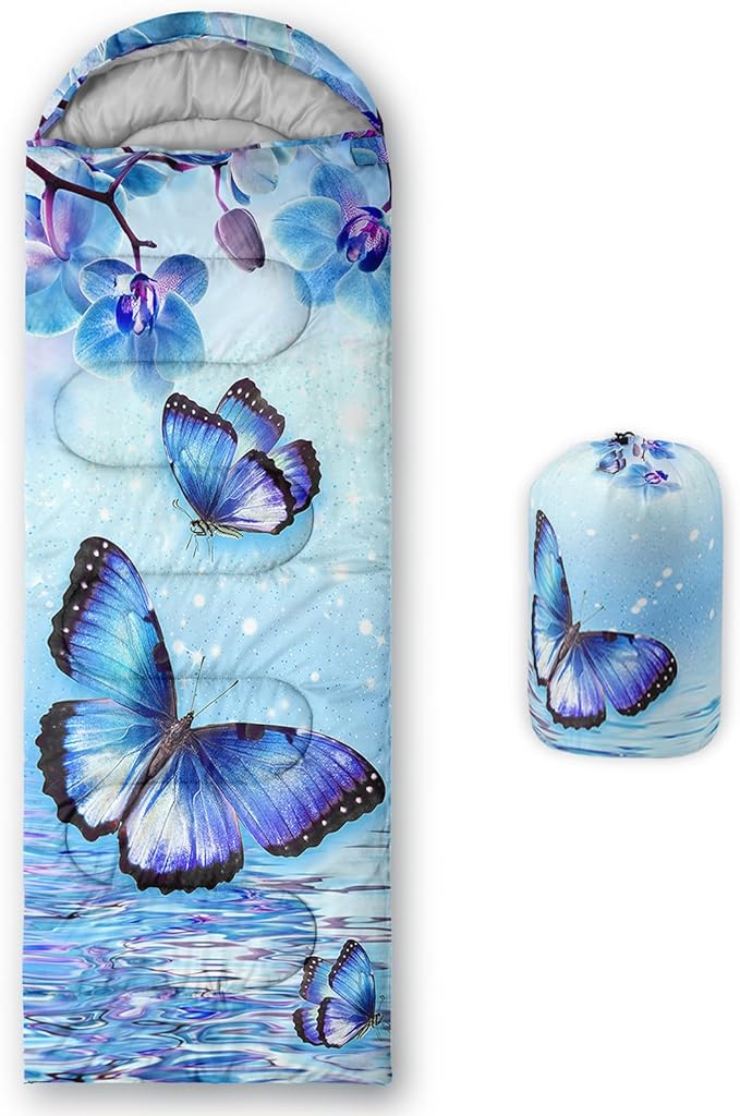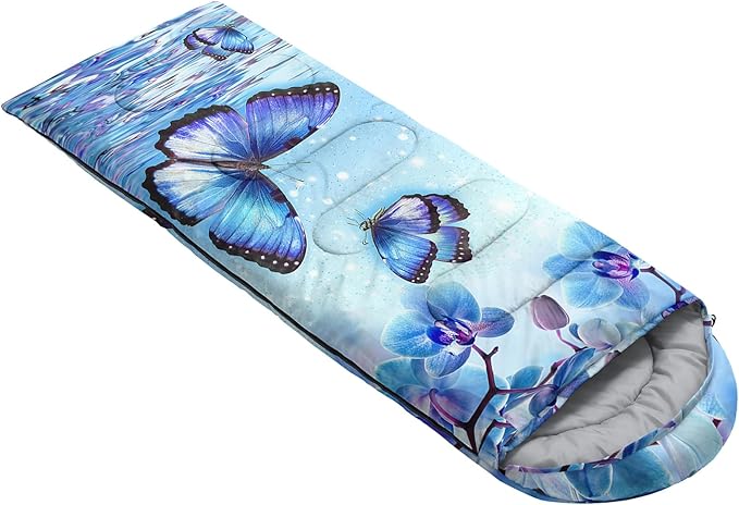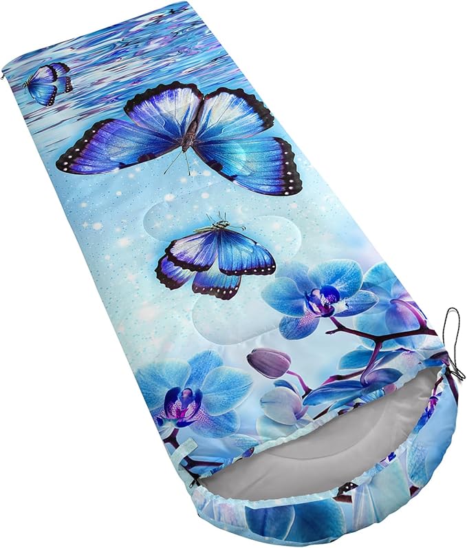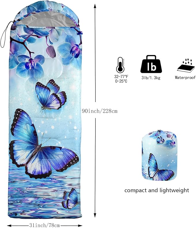 - Applicable For 3 Seasons: Our blue ripple butterfly sleeping bag can be used in temperatures ranging from 32°F-77°F Except for the cold winter,sleeping bag have weatherproof to prevent from dampness,Size is 31 x 90 inches