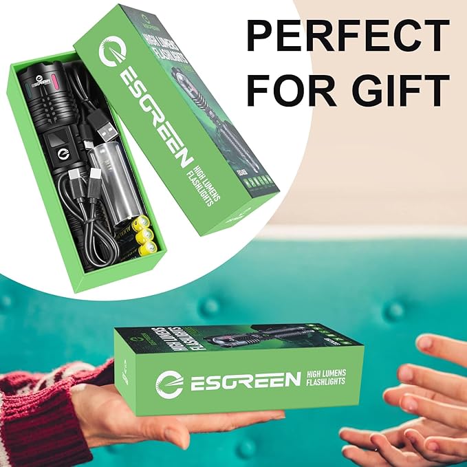 - [PACKING LIST & EXCELLENT CUSTOMER SERVICE] You will get 1x Esgreen ED2405B flashlight (6000mAh rechargeable battery included), 3x AAA Alkaline batteries, 1x USB C to USB A cable, 1x USB C to USB C cable. We are providing high quality products and the best customer service as our aims. You will be pleasantly surprised by the brightness, quality, longevity and performance of the most powerful flashlight. If you have any questions, please feel free to contact us. We will be happy to answer your questions.