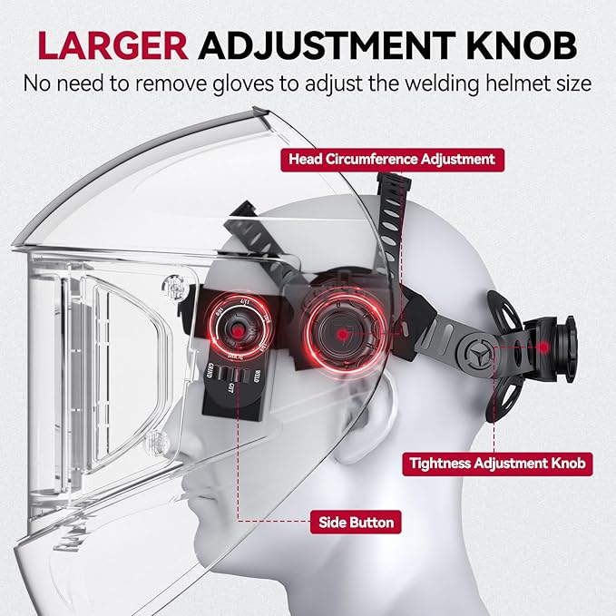 - EASIER ADJUSTMENT - The welder helmet features a newly upgraded knob section, allowing for easy adjustment even while wearing gloves. The interior of the helmet has been rearranged for a better fit to the human head, ensuring comfort even during extended wear.