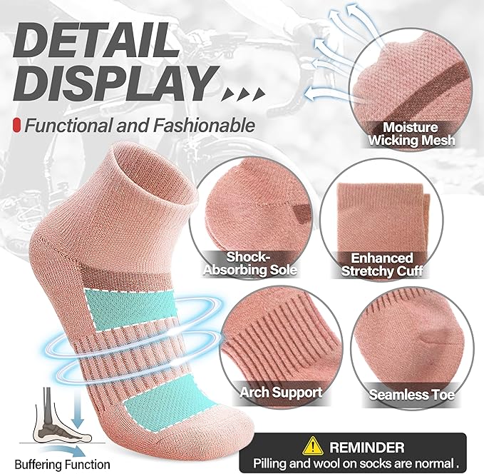 • PROTECTION FOR FEET - These womens wool running ankle socks have stretchy cuff and arch support, which can have great compression support to reduce fatigue, protect the Achilles tendon, improve the blood circulation, and keep socks fit snugly. Cushioned sole absorbs shock and reduces risk of blistering. Pull tab resist abrasion and prevent slipping. All of these provide more protection for your feet.
