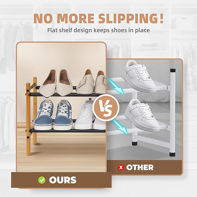 STORAGE MANIAC Expandable Shoe Rack, 8 Pairs Stackable Small Shoe Rack, Metal Adjustable Shoes Organizer for Closet, Entryway, Hallway, Garage, Front Door, Shoes Shelves, Bamboo 2 Tier