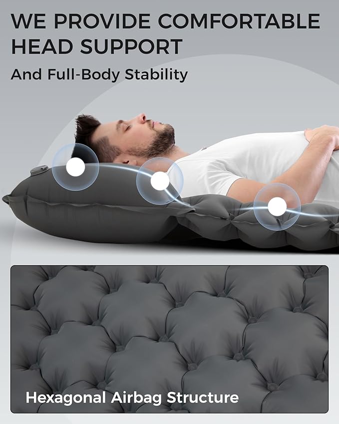 - FULL SIZE & 6.3-INCH THICK SLEEP SUPPORT – ENJOY RESTFUL COMFORT: Designed for ultimate comfort, this sleeping pad offers a spacious 75.6" x 49.2" x 3.5" surface and a 6.3" inflatable pillow for optimal neck support. The 3.5-inch thickness provides the perfect cushioning to keep you off the ground, while maintaining a compact and lightweight design. With an ergonomic shape and wave-pattern surface, it evenly distributes pressure for superior support, ensuring a restful night outdoors.