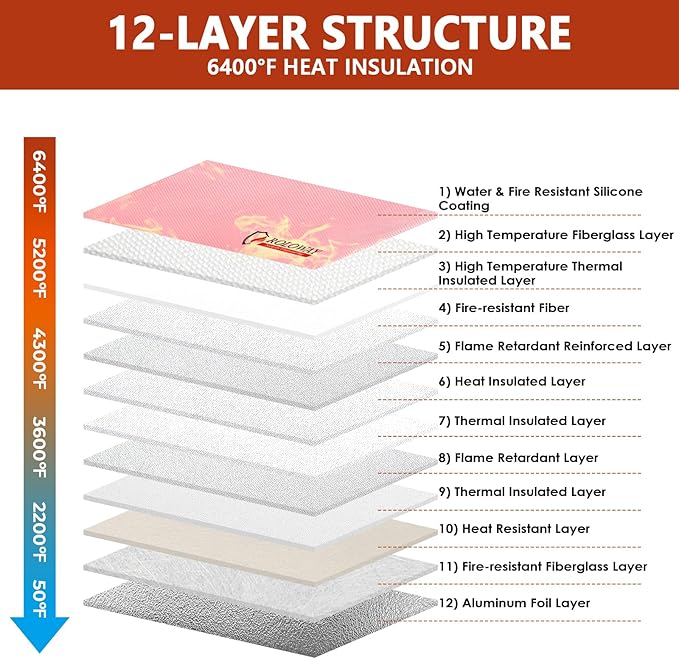 - [ADVANCED 12-LAYER FIRE PROTECTION]: Our fire proof bag for documents features an Enhanced 12-layer Structure, comprising a Waterproof Silicone Coating Layer, Fireproof Fiberglass (x3), Flame Retardant Layer (x2), Thermal Insulation Layer (x5), and an Aluminum Foil Layer. It provides critical time to retrieve your items in the event of a fire. NOTE: The silicone-coated fiberglass surface may feel STICKY. If you are sensitive to STICKINESS, this product may not be recommended for you