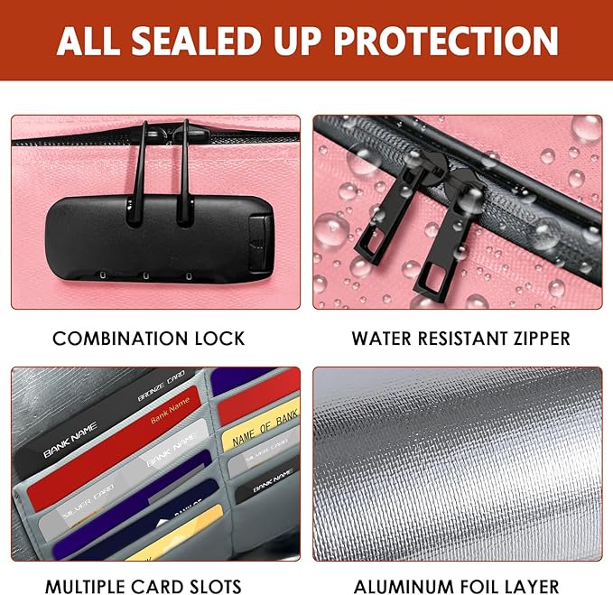 - [LARGE CAPACITY & CARD SLOTS DESIGN]: Our LARGE fireproof bag with zipper, measuring 14.5 x 11.5 inch, is designed to stow your notary supplies, A4 documents, birth certificate protector, tax files, etc, also as a bank bag with zipper / important document organizer. Meanwhile, the CARD SLOTS DESIGN of this fireproof document bag / fire proof money bag for cash enables you to better classify and protect your bank cards, ID cards and more. NOTE: PLEASE measure your items first to ensure fit