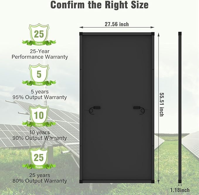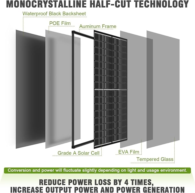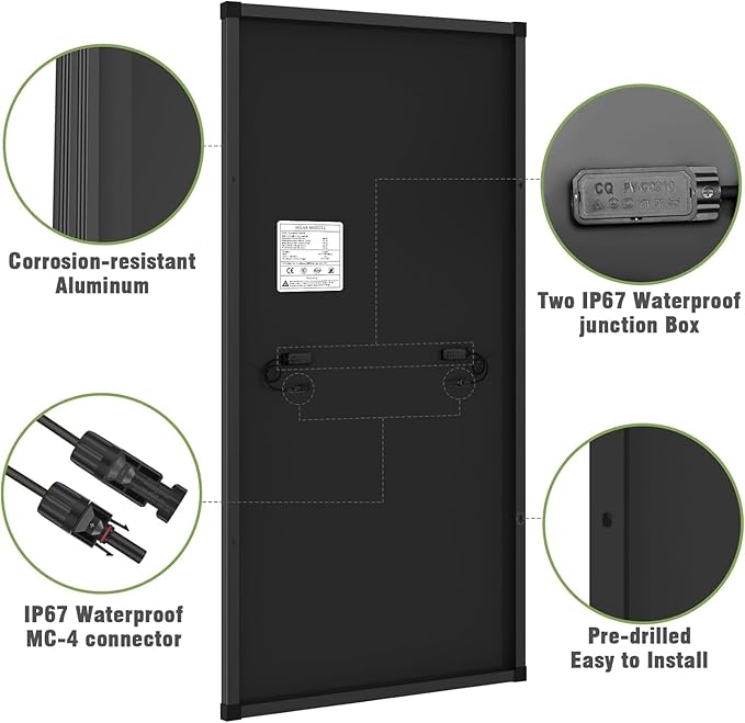 - High Quality Material: The solar panel with a low-iron tempered glass surface and corrosion-resistant aluminum frame can withstand high winds (2400pa) and snow loads (5400pa), protected against weathering and wear, 100% waterproof and rustproof and will last for decades
