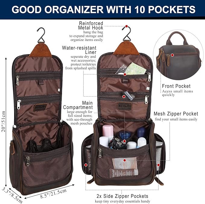 - 【Quality Materials】 Toiletry bag for men, crafted of 2mm thick full grain leather, processed with crazy horse leather tech to enhance durability and keep original pores and texture of cowhide, rough rugged look being good match to masculine style; Outfitted with ykk zippers and metal hook to to withstand long-lasting use of traveling; Water-resistant liner, easy to wipe clean, to separate dry and wet items, and to protect the toiletries from common bathroom splashed spills.