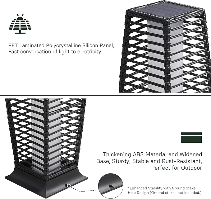 - WEATHER RESISTANT: Never worry about the harsh weather! This solar lamp is featuring an IP65 waterproof rating, resistant to rain, snow, and other conditions, which is a reliable option for your outside lighting needs