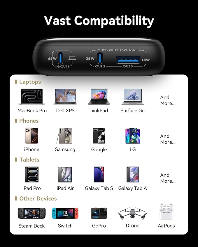 - Power Ready iPhone & MacBook in 25Mins: A must-have for multi-device users, this power bank provides up to 65W high-speed charging for two devices simultaneously. In just 25 minutes, it can charge your MacBook Air 13" to 41% and iPhone 15 to 56%. It also supports Samsung Super Fast Charging 2.2.