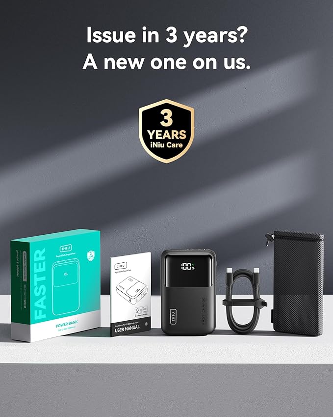 - What You Get: INIU 20000mAh power bank*1, 100W USB-C to USB-C Cable 1ft*1, welcome guide*1, industry-leading 4-Year iNiu Care, plus lifetime technical support.