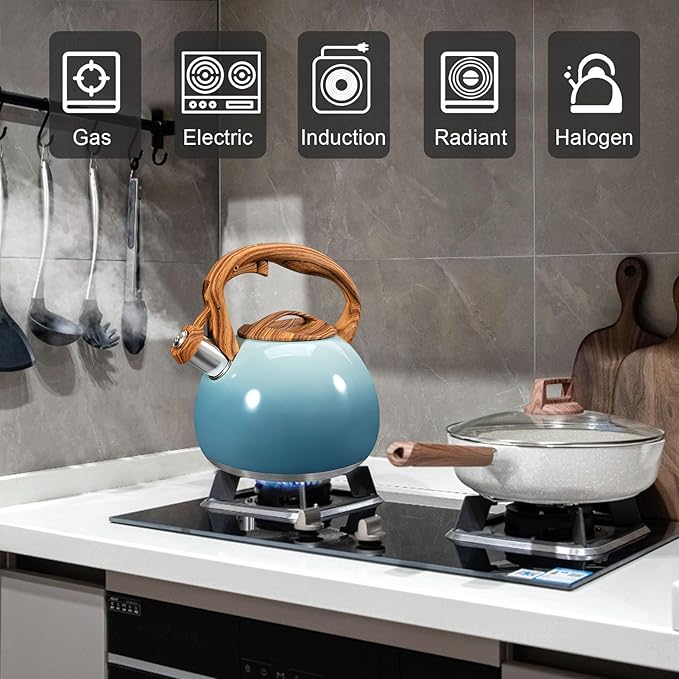 - 【Apply to Various Stovetops】The whistling tea kettle compatible with various cookware, including gas stoves, electric stoves, induction cookers, and radiant ovens. Note:Please avoid empty burn and use a low or medium fire to heat the kettle to prevent the flame from burning out the spout or discoloring the kettle body