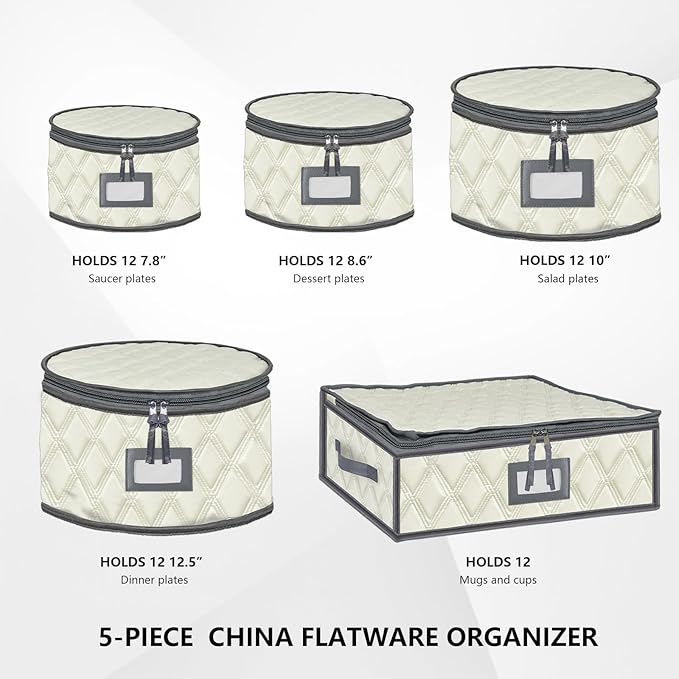 VERONLY 5 Pack China Storage Containers Set (Beige) - Sturdy Quilted Wine Glass & Dish Storage with Dividers - Compact Size