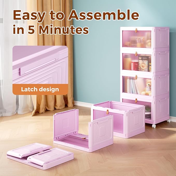 4 Tier Stackable Plastic Storage Bins with Lid and Wheels - 23 QT Closet Organizers and Foldable Storage Containers, Organization Boxes for Craft, Home, Pantry, Dorm, Pink