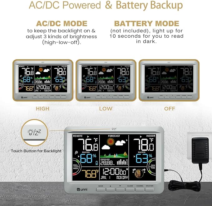 - AC/DC Powered & Battery Backup - AC/DC MODE: to keep the backlight on & adjust 3 kinds of brightness (high-low-off). BATTERY MODE(not included), light up for 10 seconds for you to read in dark.