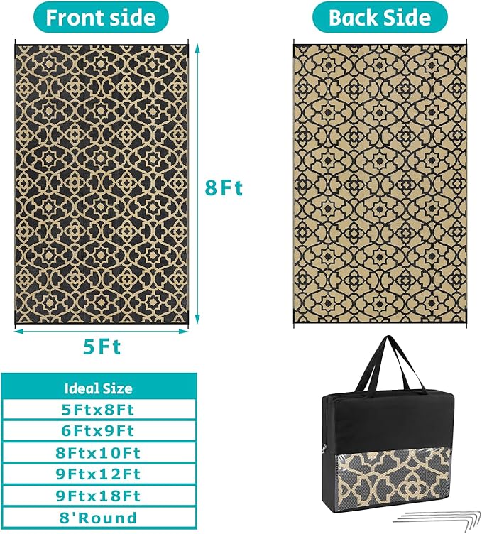 - Versatile Outdoor Carpet: The indoor outdoor plastic rugs have multiple choice in different colors(4'x6',5'x8',6'x9',8'x10',9'x12',9'x18',8'round), is ideal for a variety of indoor outdoor activities,like patio mat, deck rug, garden rug, beach mat, picnic mat, BBQ party mat, rv camping rug,pool rug,outdoor doormat,garage rug,front door mat,allowing you to have plenty of imaginable space for more fun.