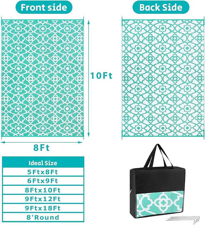 - Versatile Outdoor Carpet: The indoor outdoor plastic rugs have multiple choice in different colors(4'x6',5'x8',6'x9',8'x10',9'x12',9'x18',8'round), is ideal for a variety of indoor outdoor activities,like patio mat, deck rug, garden rug, beach mat, picnic mat, BBQ party mat, rv camping rug,pool rug,outdoor doormat,garage rug,front door mat,allowing you to have plenty of imaginable space for more fun.