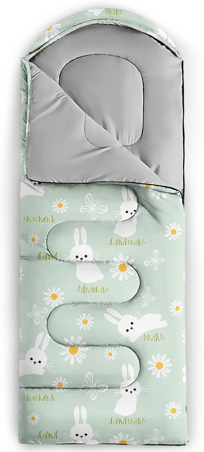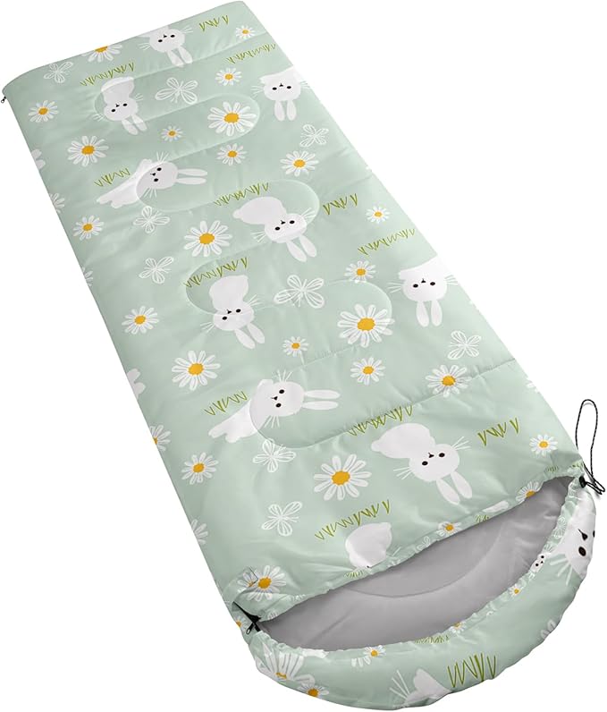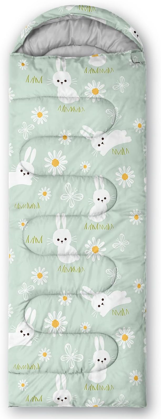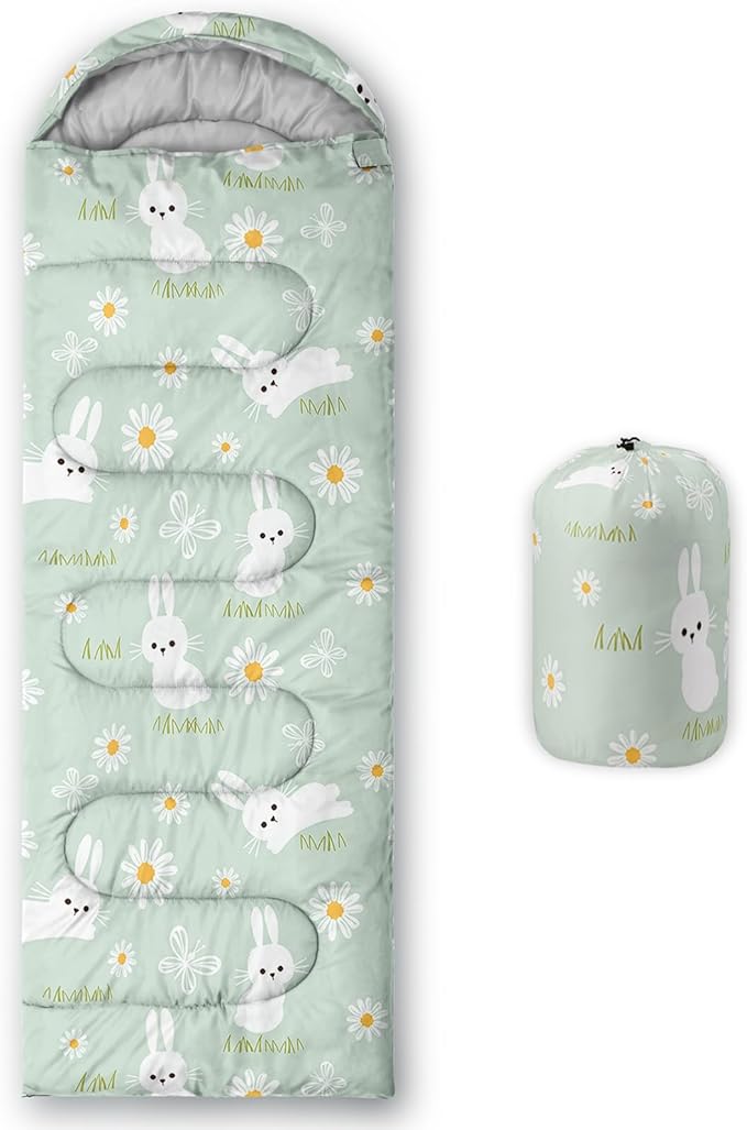 - Unique Rabbit Design:This Rabbit pattern sleeping bag is made of 3D digital printing with vibrant colors and patterns,size: 31W x 90L inches,temperature range: 32℉-77℉ (0℃-25℃),it also also have a weather resistant waterproof design to keep you warm and prevent you from any dampness,can be used in 3 seasons