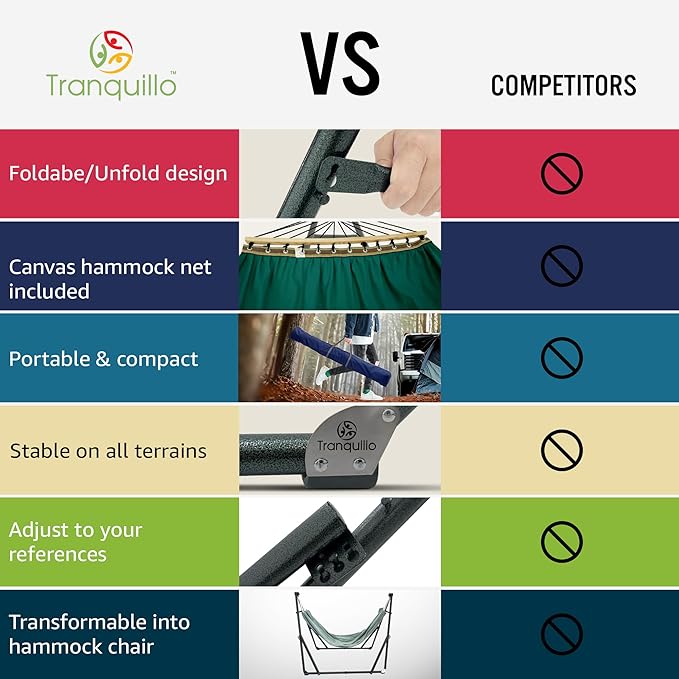 - PATENTED INNOVATIVE DESIGN: Proudly patented for its smart, tool- free setup in just 30 seconds, the Tranquillo Hammock with stand offers effortless outdoor relaxation. Easily adjustable for perfect comfort, built with durable materials for long-lasting use