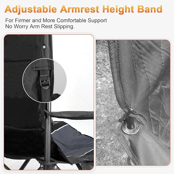 - Adjustable Elastic Strap Armrests Support: Romswi oversized lawn folding chair can adjust the telescoping straps on the back to adjust the height of the chair's armrests support for more comfy position.You don't have to worry about the handles slipping off under pressure
