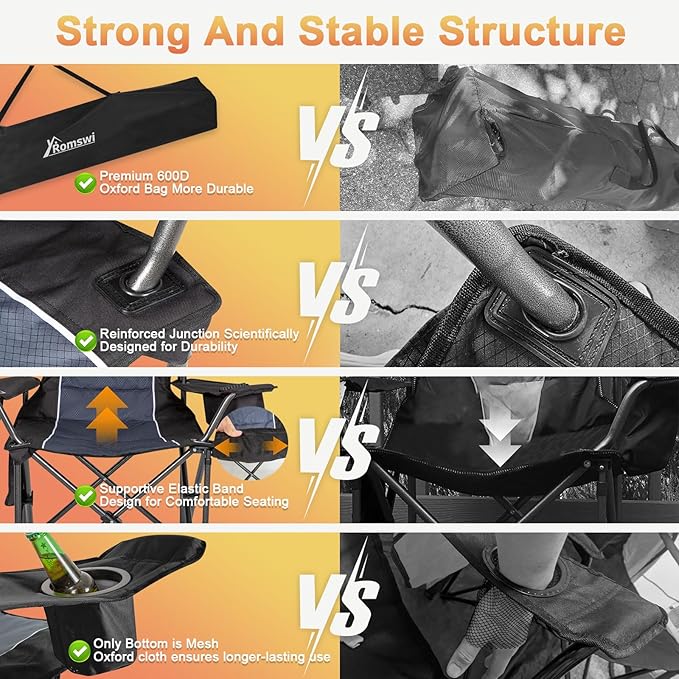 - 100% Oxford Fabric:Our large outdoor folding chair is crafted from a double-layer, rip-resistant 600D Oxford fabric and features a sponge cushion, ergonomic padded high back and armrests ensuring both durability, breathability and comfort