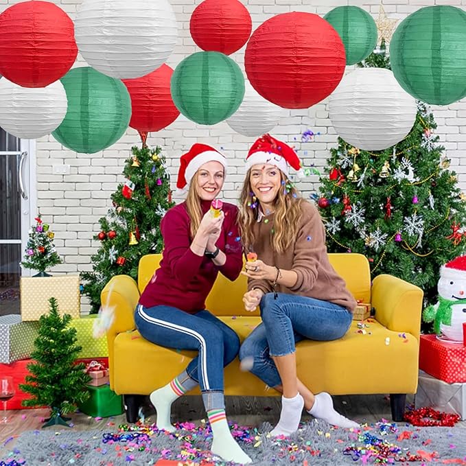 BEISHIDA 12Pcs Red Green White Paper Lanterns Decorative Hanging Round Paper Lanterns Lamp for Christmas,Birthday, Wedding,Bridal,Home Decor,Outdoor Decoration,Party Decoration