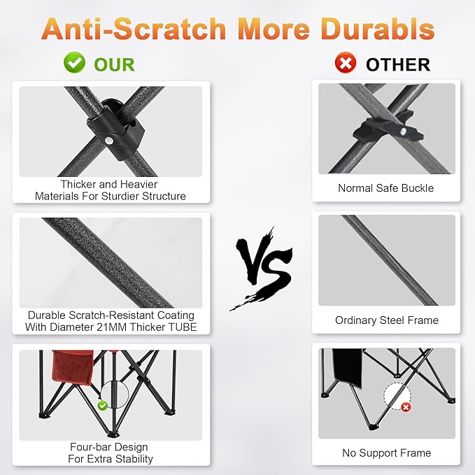 - Heavy Duty Camping Chair: Our Xl camping chair open dimension 24" L x 38.5" W x 42"H and it with more higher and more wider seat.This outdoor chair's the frame, coated with sturdy, scratch-resistant paint, is capable of supporting up to 500 lbs.Additionally, the non-slip textured feet provide a stable and secure seating experience