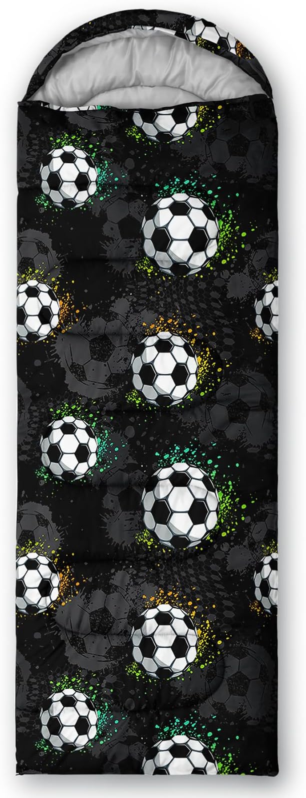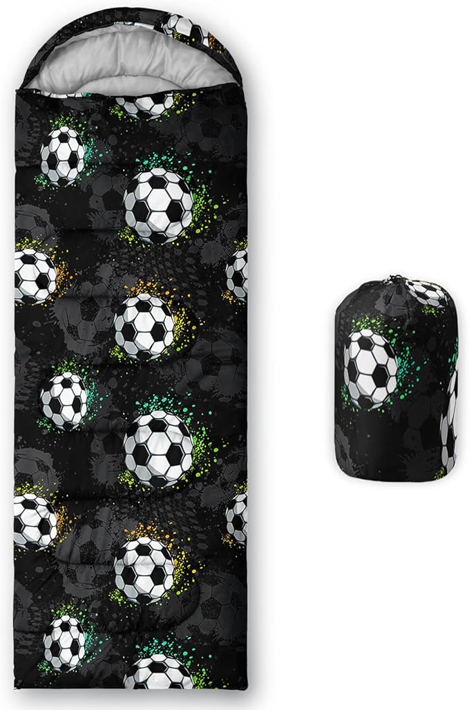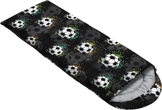 - Unique Soccer Design:This Soccer pattern sleeping bag is made of 3D digital printing with vibrant colors and patterns,size: 31W x 90L inches,temperature range: 32℉-77℉ (0℃-25℃),it also also have a weather resistant waterproof design to keep you warm and prevent you from any dampness,can be used in 3 seasons