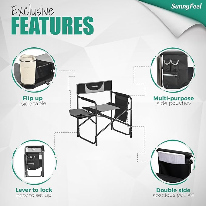- A Camping Director Chair that is Built for Anywhere: Use it as a camping chair, folding chair, lawn chair, travel chair, beach chair and more. Suitable for outdoor adventures, tailgating, fishing, backpacking, beach, picnic, sport games, car travelling, or just put it in the backyard, cabin, balcony, patio lawn parties. The SunnyFeel camping chair is an essential to add to your camping accessories.