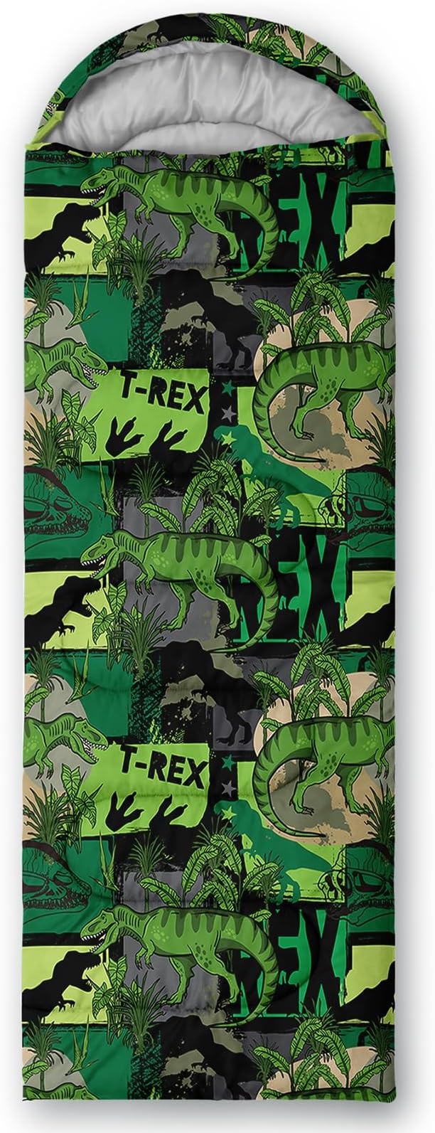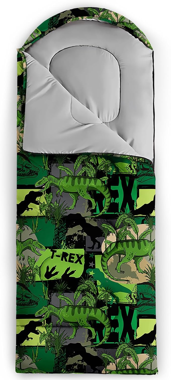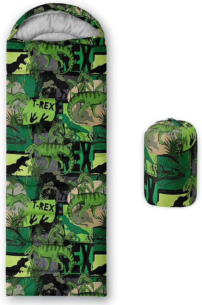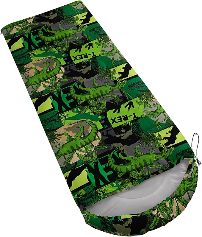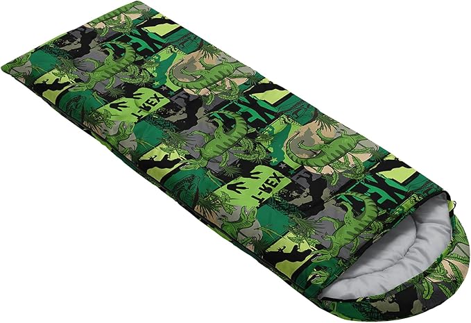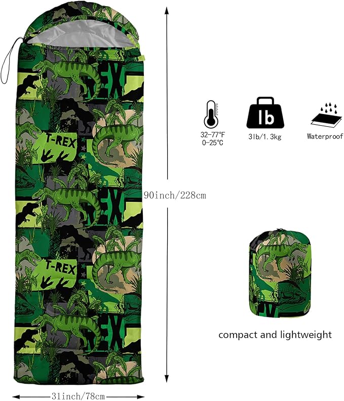- Unique Dinosaur Design:This Dinosaur pattern sleeping bag is made of 3D digital printing with vibrant colors and patterns,size: 31W x 90L inches,temperature range: 32℉-77℉ (0℃-25℃),it also also have a weather resistant waterproof design to keep you warm and prevent you from any dampness,can be used in 3 seasons