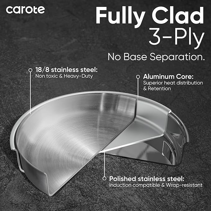 - Fully-clad 3-ply stainless steel base ensures faster, more consistent heat distribution, eliminating hot spots for perfectly cooked meals every time.
