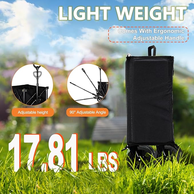 - STURADJUSTABLE HANDLE UTILITY WAGON: Adjustable angle drawbar can be adapted to different heights of people, easy to pull, whether it's a child or adult old people can be very easy to comfortably pull wagon.In addition, the folding garden wagon also has a locking device so that you don't have to worry about the handle is easy to fall off or out of control.Waterproof fabric, waterproof and durable, tear resistant, removable and washable
