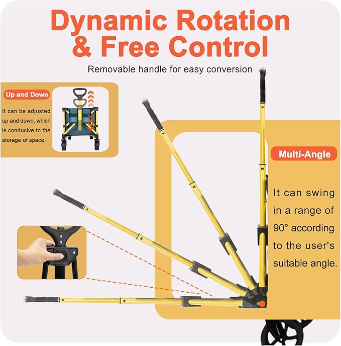 - FLEXIBLE MOBILITY WAGON CART: This collapsible wagon with wheels couldn't be easier to assemble. Pop the wheels in--don't have to worry that you get the wheels on right because there are two round and two square slots to match the two round- and two square-pegged wheels. The wide front wheels can rotate 360 degrees, when you hauling things on a brick or cobblestone street, you can still move easily