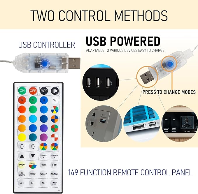 - Remote Control: Take charge of your lighting with the included 44-key wireless remote. Effortlessly customize colors, modes, brightness levels, and set timers with ease. Choose from 17 vibrant colors and 8 lighting modes (including fade, jump, and twinkle), and adjust the speed in four levels. The timer feature allows you to set it for 4, 6, or 8 hours of illumination.