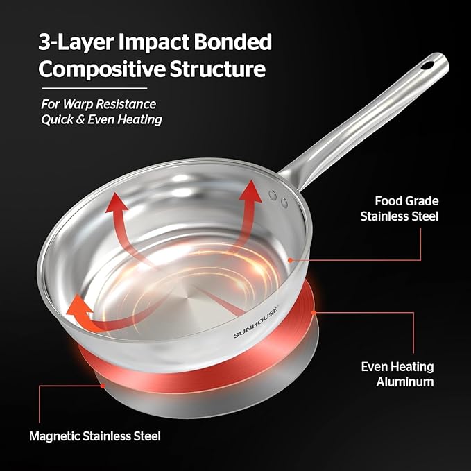 Sunhouse 18/10 10 Inch Stainless Steel Frying Pan, Whole-Clad No Coatings Skillet with Stay-cool Handle for Cooking, Durable & Oven Safe to 500°F, Dishwasher Safe, Compatible with All Cooktops