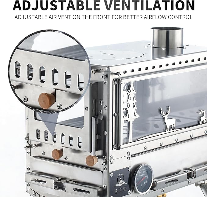 - EFFICIENT HEATING: The wood-burning stove features adjustable ventilation holes at the front, allowing for precise control of flame combustion. Top air intake holes increase oxygen supply, promoting vigorous combustion and preventing glass from becoming soot-stained. The stove's interior offers ample space, accommodating 16-inch-long logs, and can quickly heat a 500-square-foot tent, making it suitable for both outdoor and indoor use.