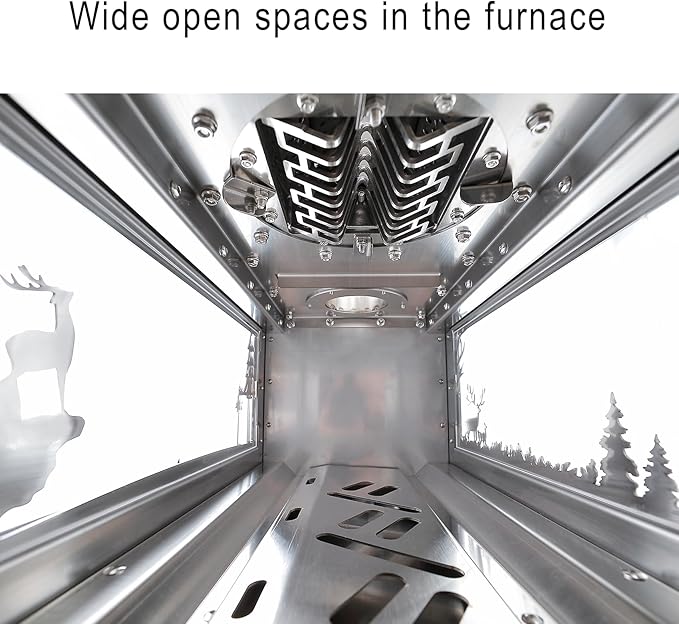 - HIGH-QUALITY CONSTRUCTION: The wood-burning stove is built from heavy-duty 304 stainless steel, precision-cut with laser equipment for airtight sealing that prevents combustion gases from escaping. It delivers exceptional durability, corrosion resistance, and high-temperature tolerance, making it ideal for extreme environments and long-term use. Edges are professionally deburred for safe handling, while three sides feature elegant microcrystalline glass rated up to 1200 °C, allowing clear flame monitoring and effortless refueling.