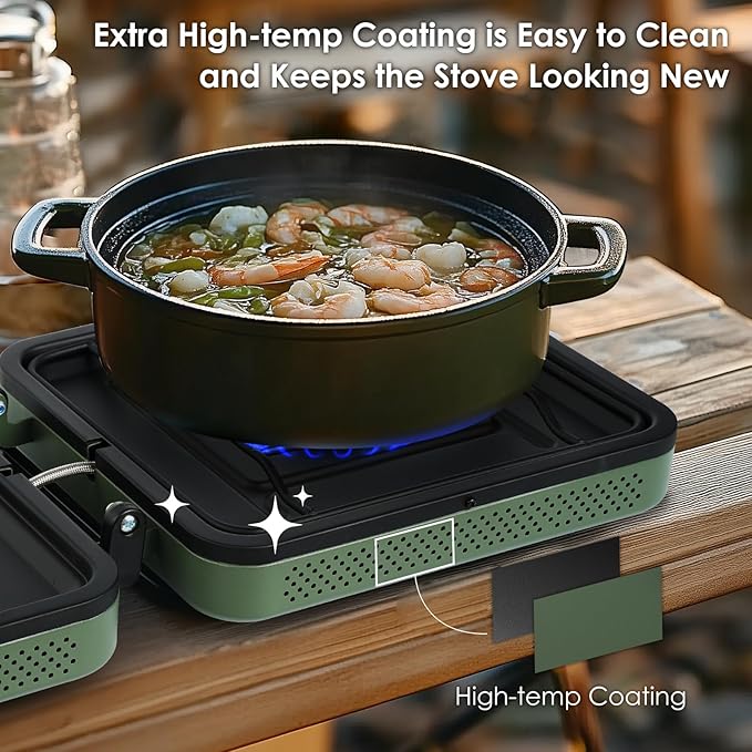 - 【Durable and Easy to Clean】The foldable camping stove is built for durability with a high-temperature-resistant steel body and a corrosion-resistant stainless steel burner. The camping stoves portable propane upgraded non-slip matte grate keeps pots stable, while key components are easy to disassemble for cleaning. The portable propane stove's heat-resistant coating on the stove surface ensures simple, hassle-free maintenance.