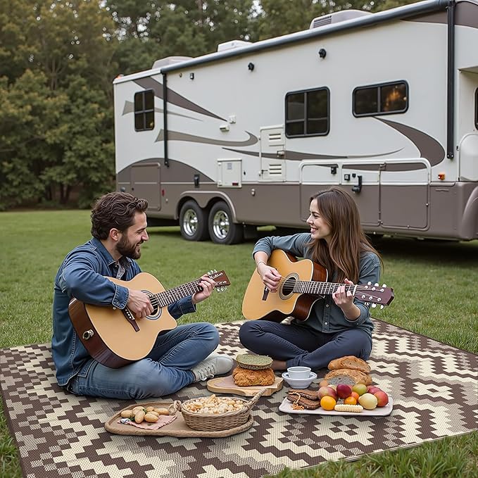 - Extended Lifespan · Dual-Sided Wear Resistance: The GENIMO outdoor rug features a reversible design with two classic geometric patterns, doubling its lifespan through alternating use. The dark-toned surface effectively conceals dirt, stains, and fall debris, maintaining a pristine appearance even in rugged environments. Perfect outdoor patio rugs, RV mats, and camping rugs for indoor-outdoor transition zones—effortlessly switch sides for practicality and timeless decor.
