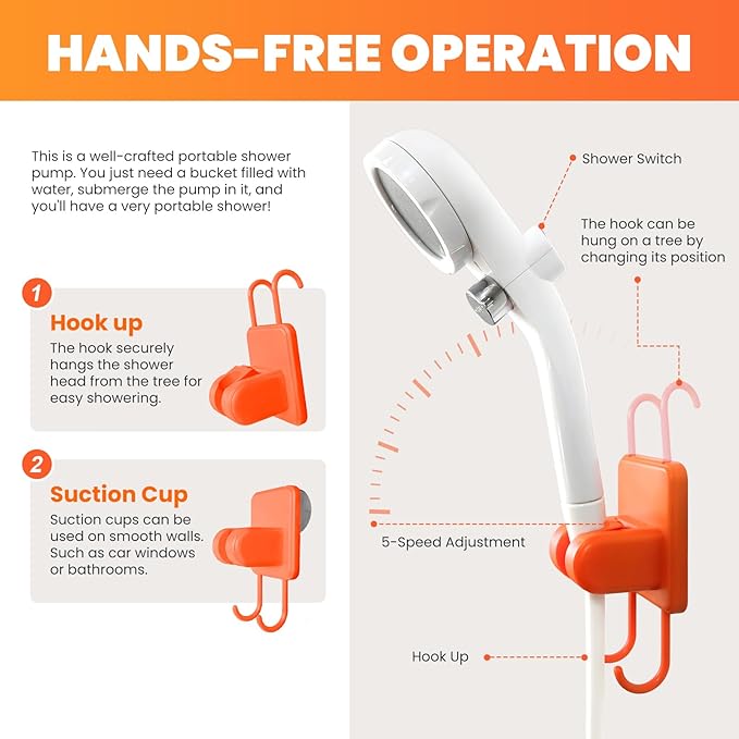 - 【Upgraded Large-Capacity Water Pump】 Featuring a 6000mAh battery, the Carry-Pro electric shower offers an impressive 120-150 minutes of continuous use, elevating your outdoor experience with consistent, high-quality performance for all your outdoor activities.