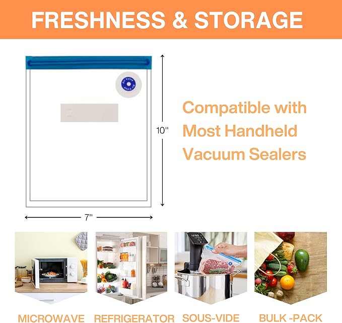 Vacuum Zipper Bags - Space-Saving Food Storage Bags for Vacuum Sealing, Reusable & BPA-Free, Ideal for Travel and Camping, Keeps Food Fresh (7" x 10" 10 count)
