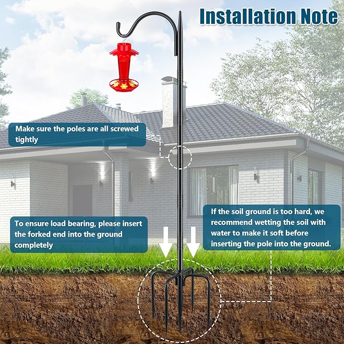 - ?�INSTALLATION NOTES?‘Please tighten each connecting rod to ensure structural stability. Shepherds hooks are suitable for soil ground, if the soil ground is too hard, we recommend wetting the soil with water to make it soft before inserting the pole into the ground. You can either step on the 5 prongs base with your foot or use a rubber hammer to insert it into the ground. To keep from damaging the 5 prongs base, please do not hit it with a metal hammer when inserting it into the ground. Please insert the forked end into the ground completely to ensure load bearing