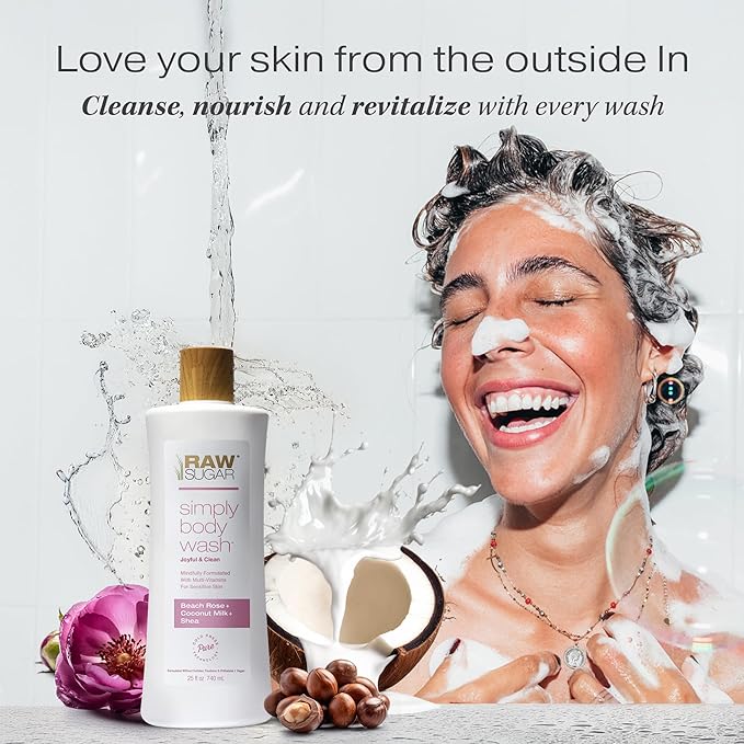 RAW SUGAR Simply Body Wash, Beach Rose + Coconut Milk + Shea (25 Fl Oz, Pack of 1) Sensitive Skin Bath Soap, Formulated without Sulfates & Parabens