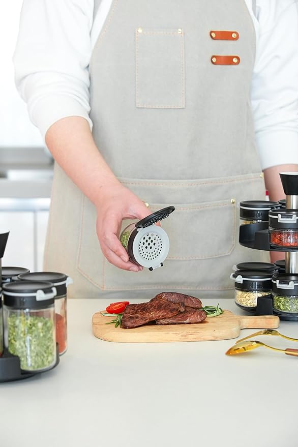 - ● High Quality Seasoning Rack: This innovative and made of high quality material makes cooking easier. It provides 3 in 1 option: you can pinch, scoop, and 2 sizes sprinkle. It takes a small amount of space whether on countertop or inside a cabinet. Each jar is made of high quality food grade thick glass for safe, hygienic and sturdy experience.