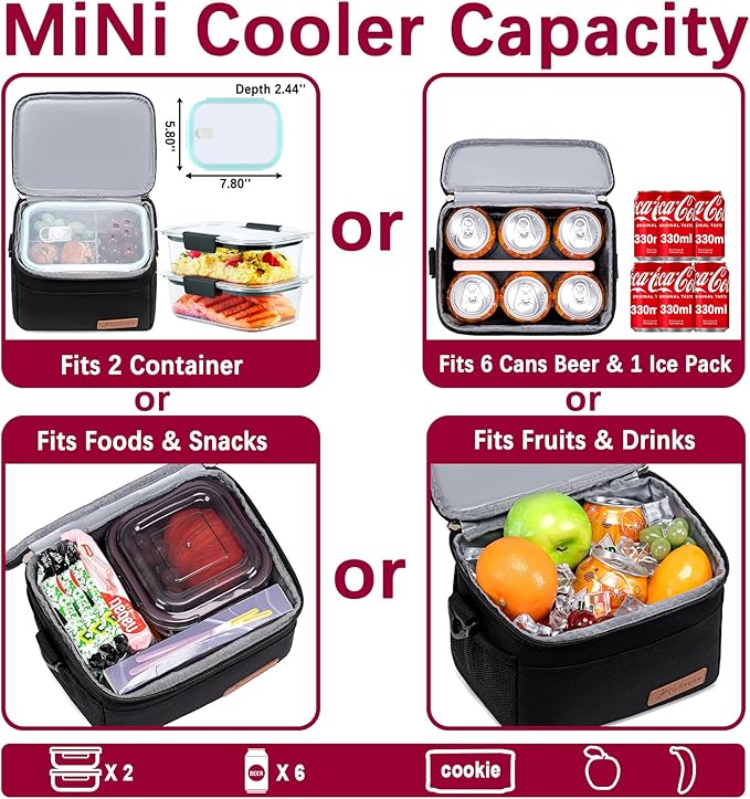 - Dimensions & Capacity: Our mini cooler measures 6.70 x 6.30 x 9.05 inches (L x W x H) and holds up to 5 liters. The main compartment fits 6 cans of 330ml cola or 2 food storage containers plus ice