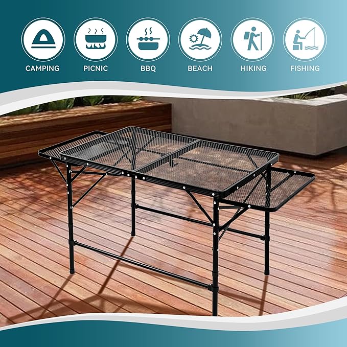 - Versatile: Portable folding table with mesh side racks, perfect for camping, tailgating, picnics, and outdoor dining.