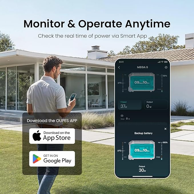 - 【Smart App Control】Using the OUPES app via Wi-Fi or Bluetooth. Monitor the real-time status (including remaining battery level, estimated running time, and input/output wattages) and customize the settings according to your needs.